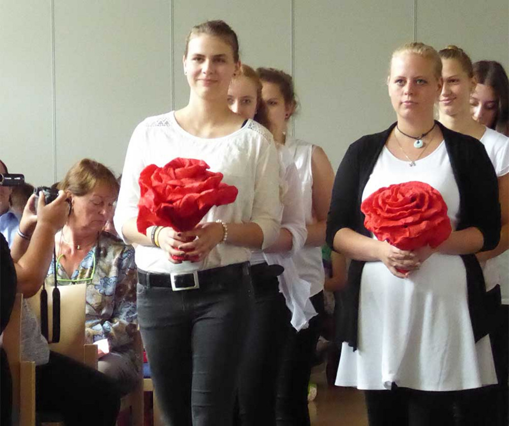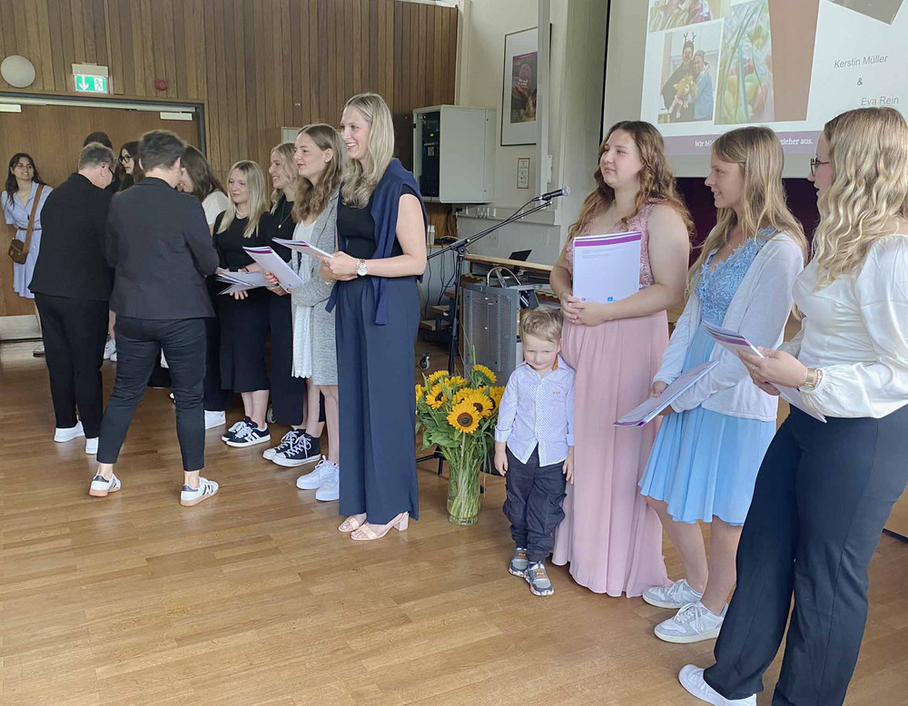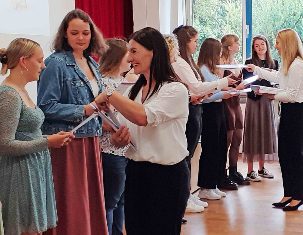 Ende Juli 2023 erhielten die Schülerinnen und Schüler der beiden Oberkurse im feierlichen Rahmen ihre Abschlusszeugnisse überreicht. Ein besonderer Tag, auch für die drei Klassenlehrerinnen und die gesamte Schulgemeinschaft. Wir freuten uns sehr über die vielen Angehörigen der Schülerinnen und Schüler, die ebenfalls Teil dieser Feierlichkeit waren. Nach einer Ansprache durch die die Schulleiterin Gabriele Beier blickten die drei Klassenlehrerinnen noch einmal auf den bereits zurückgelegten Ausbildungsweg und erinnerten an die Einzigartigkeit aller Auszubildenden: