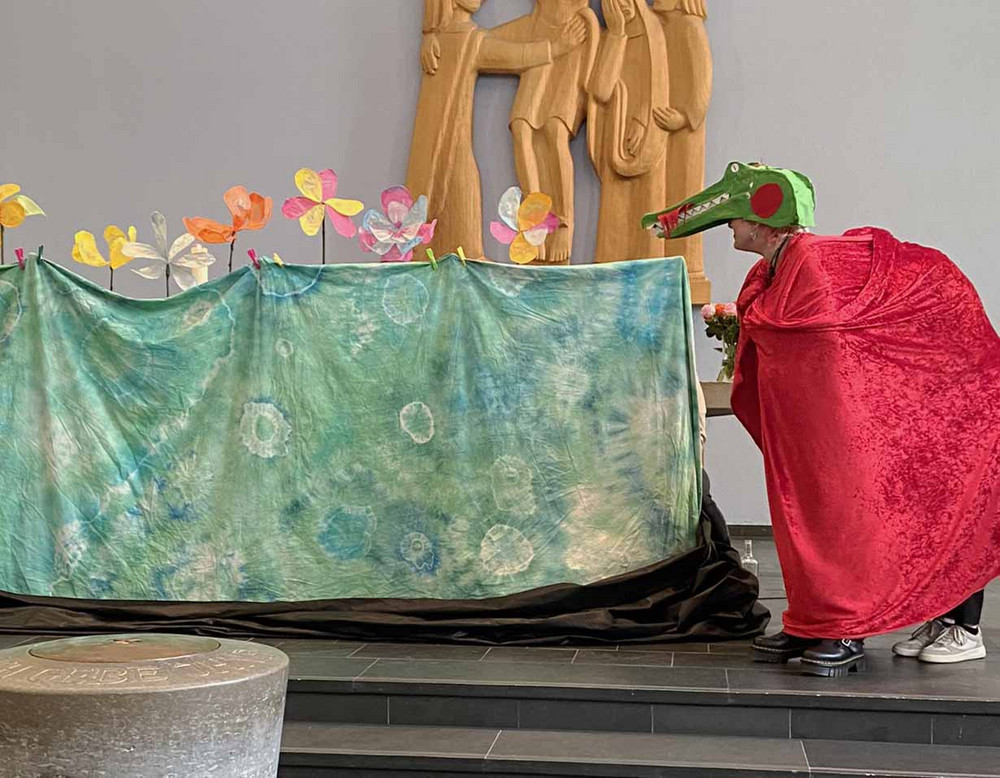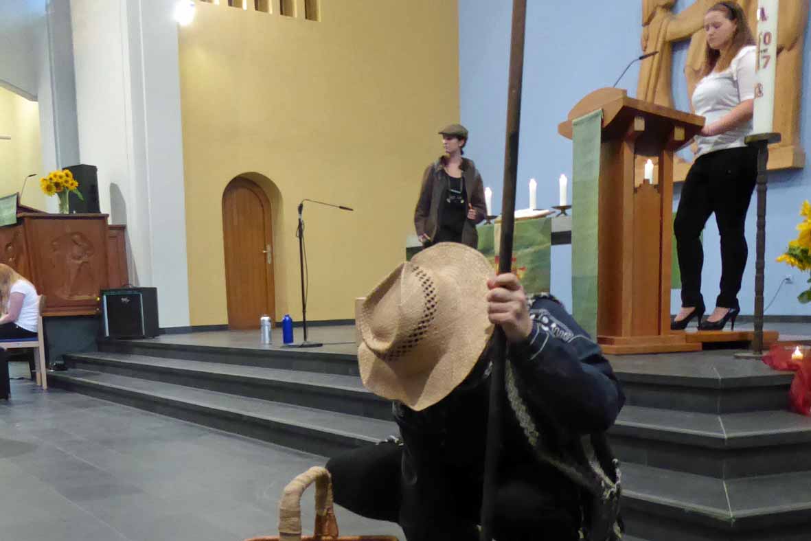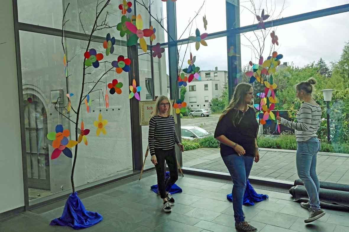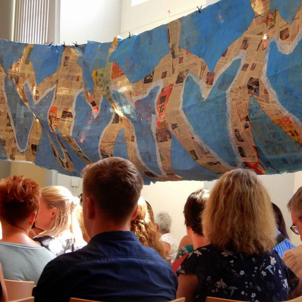 In der Gestaltungsgruppe haben wir aus Altpapier Pappmaché-Opferkörbe hergestellt, handgeschöpfte Give- away-Karten gestaltet und zwei 14 Meter lange Banner entwickelt. Der Weg vom Modell bis zur Realisation im Kirchenraum wurde mit allen materiellen und technischen Aufgaben erfahren.