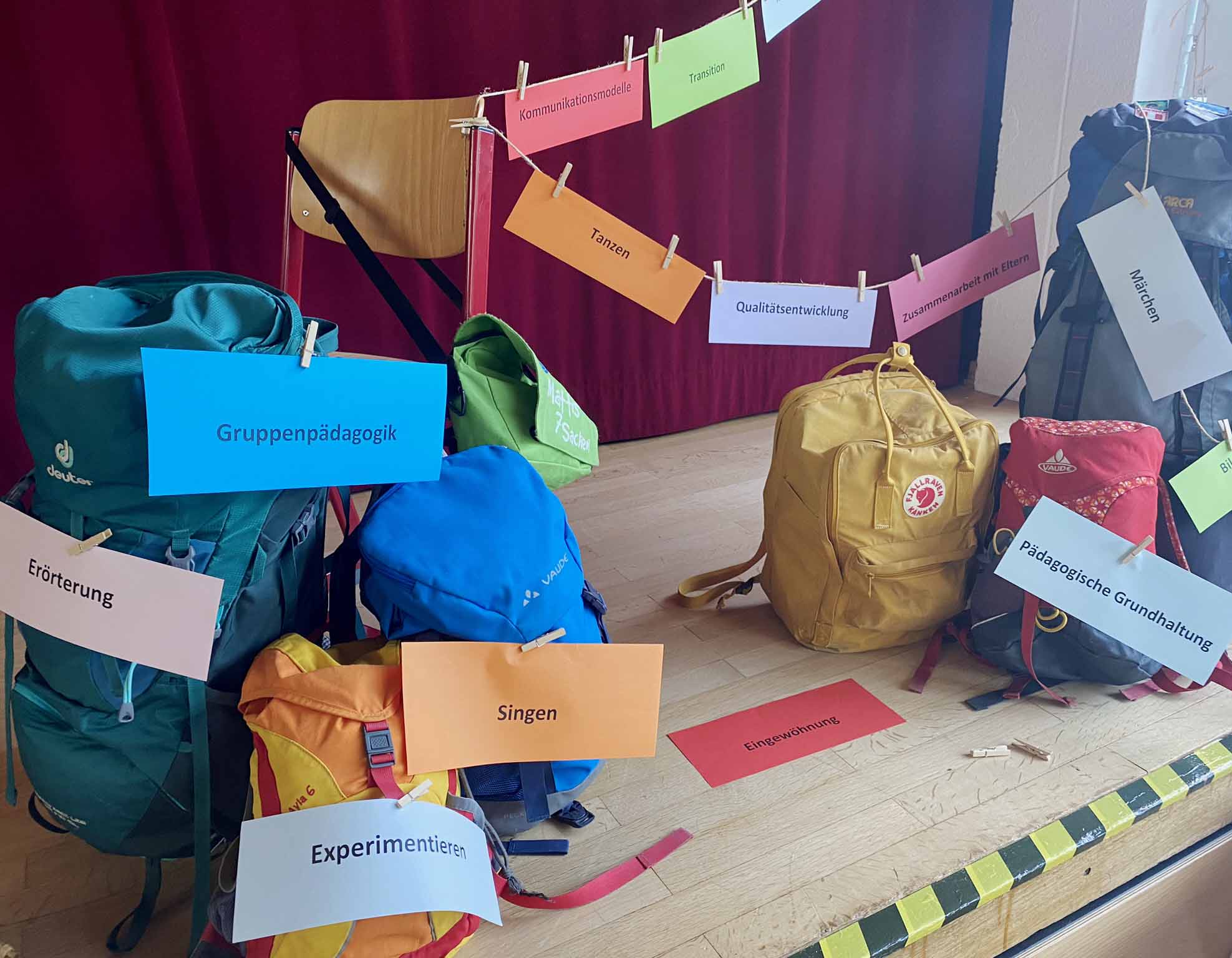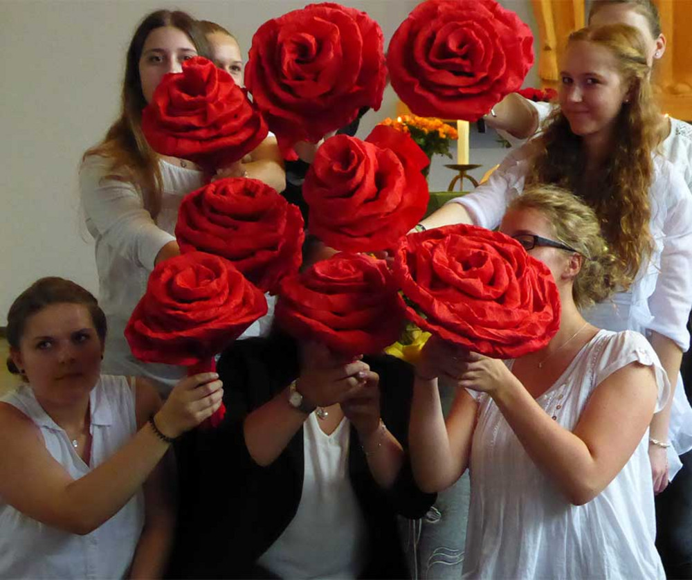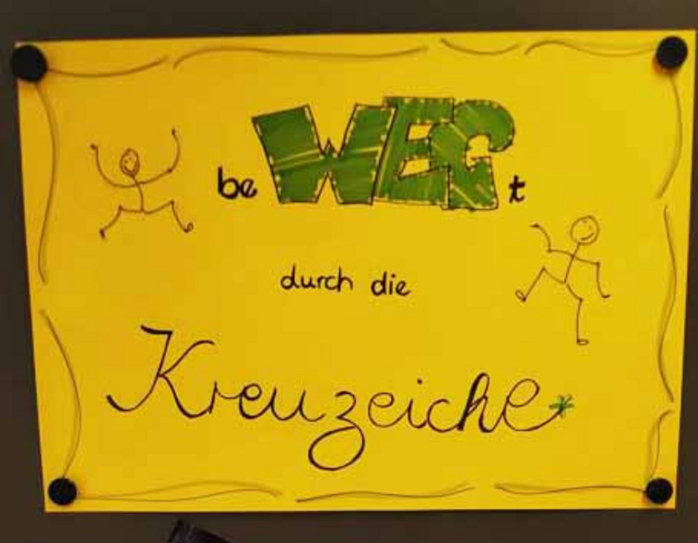 „Wir hatten beWEGte Zeiten an der Kreuzeiche, bestückt mit vielen verschiedenen WEGen, die Sie beschritten hatten. WEGe über verschiedene Unterrichtstunden, Praxisphasen, Projekttage, Ausflüge, Klassenfahrt, etliche Klassenarbeiten, Exkursionen, Gestaltung des Abschlussgottesdienstes im letzten Jahr, geschriebene Seiten von Facharbeiten ... um nur einige wenige WEGe zu nennen. Uns als Klassenlehrerinnen war es immer ein Anliegen, über die Kurse hinweg, für Begegnungen zu sorgen. Und unserem Motto entsprechend, immer mit Ihnen in BeWEGung zu bleiben. Wir glauben, dass das gelungen ist. Von Anfang an, seit wir mit Ihnen Ihren Weg in den Erziehungsberuf gegangen sind, haben wir mit dem Bild des „Pädagogen-Rucksacks“ gearbeitet. Wir haben versucht, Ihnen Angebote zu machen, Ihren persönlichen Rucksack gut zu schnüren, mit allem, was Sie für den Start in der Praxis benötigen. Ein großer und bunter Strauß an Inhalten und Angeboten durch uns Lehrkräfte mit jeweils eigenen Vermittlungsversuchen und Methoden kamen in den Rucksack hinein. Ihr Weg an der Schule ist nun zu Ende, Ihr persönlicher Rucksack ist gepackt und uns bleibt die Möglichkeit, Ihnen einen letzten kleinen Gruß mit auf den Weg zu geben. „Alles was ihr tut, geschehe in Liebe“, die diesjährige Jahreslosung aus 1. Korinther 16, 14 sei Ihnen Wegweiser! Nehmen Sie Ihre Rucksäcke mit, füllen Sie diese weiter mit allem, was gut ist, und seien Sie fortan liebevolle Wegbegleiterinnen und Wegbegleiter für die Ihnen anvertrauten Menschen. Mögen Ihre Schritte allzeit gelenkt durch die Liebe zu Menschen sein, in sozialer Verantwortung und behalten Sie sich immer einen offenen und neugierigen Blick auf Ihrem Weg. Für Ihren nächsten weiteren Schritt auf dem Weg in das Berufsfeld und Ihren weiteren Lebensweg wünschen wir Ihnen, dass Gott seine schützende Hand über Sie hält und Sie immer seine liebende Nähe spüren.“