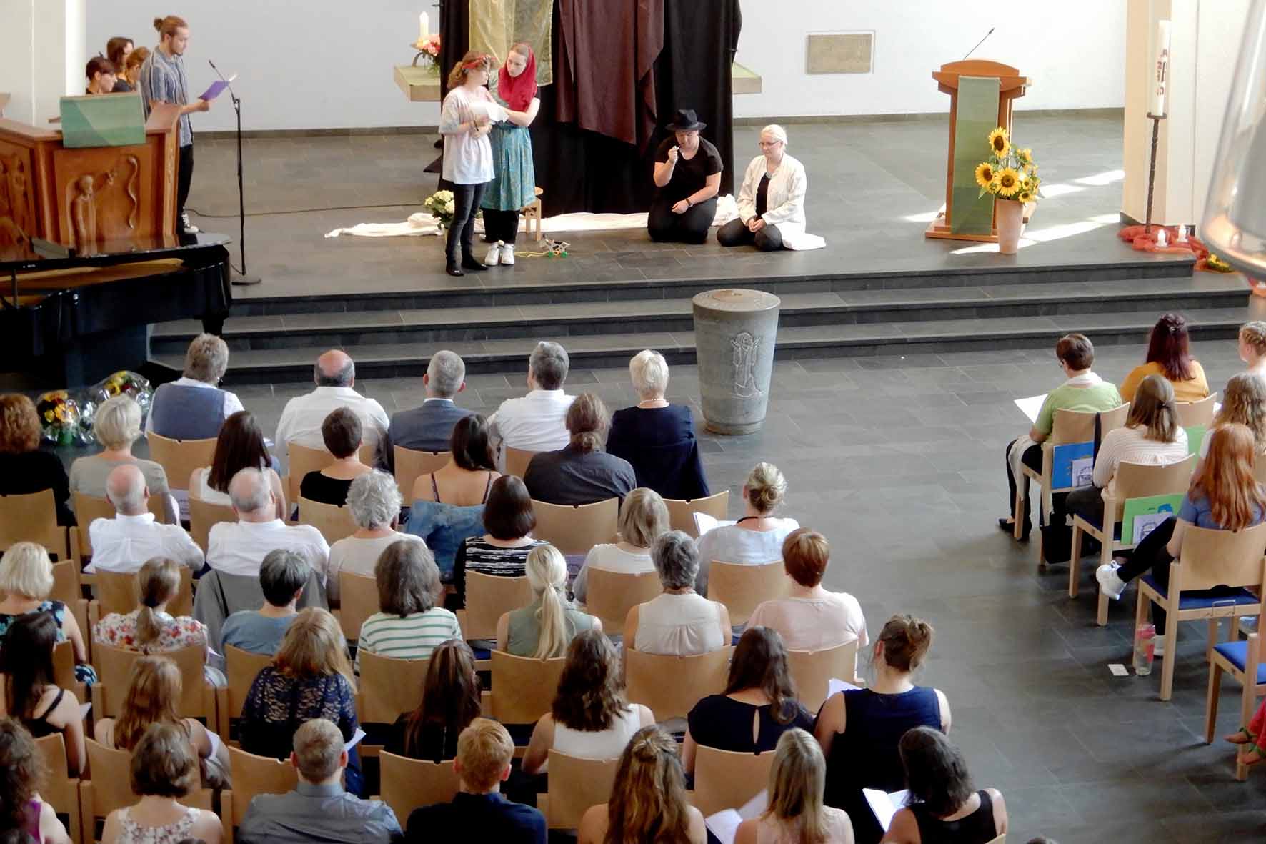 Der vom Unterkurs festlich gestaltete Gottesdienst zum Thema „Baum“ begleitete mit Liedern, Gedanken, Gebeten, einem Anspiel und einem Tanz die ganze Schulgemeinschaft und deren Freunde und Verwandte in die verdienten Ferien.