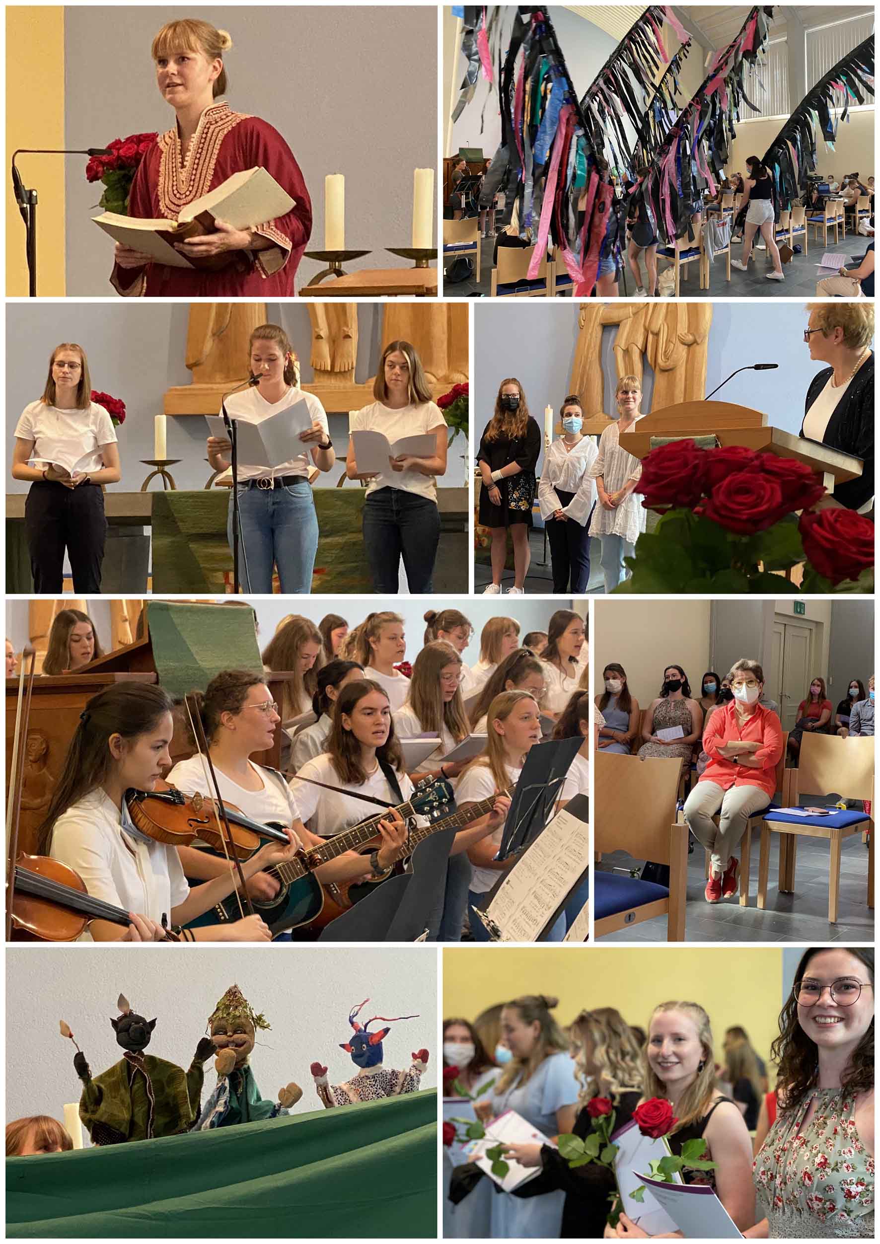 Ein vom Unterkurs kreativ gestalteter Gottesdienst bildete den Abschluss des Schuljahres 2021/22. Gute Wünsche, Gedanken zum Thema "Wurzeln und Flügel", ein Anspiel, ein Puppenspiel, eine Performance mit Riesenflügeln, Musik und Gesang ergaben einen fröhlichen Ausklang. Ein schöner Abschluss für die Schulgemeinschaft und unserer Schuldekanin Gudrun Bertsch. Mit der Überreichung der Zeugnisse wurden die Oberkurse und das Berufspraktikum in die Ferien entlassen. Wir wünschen alles Gute für den Start ins Berufsleben!