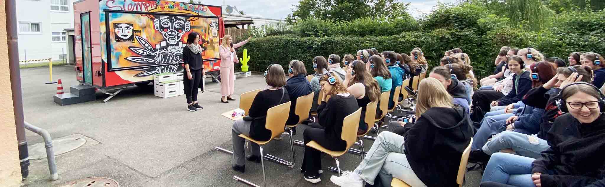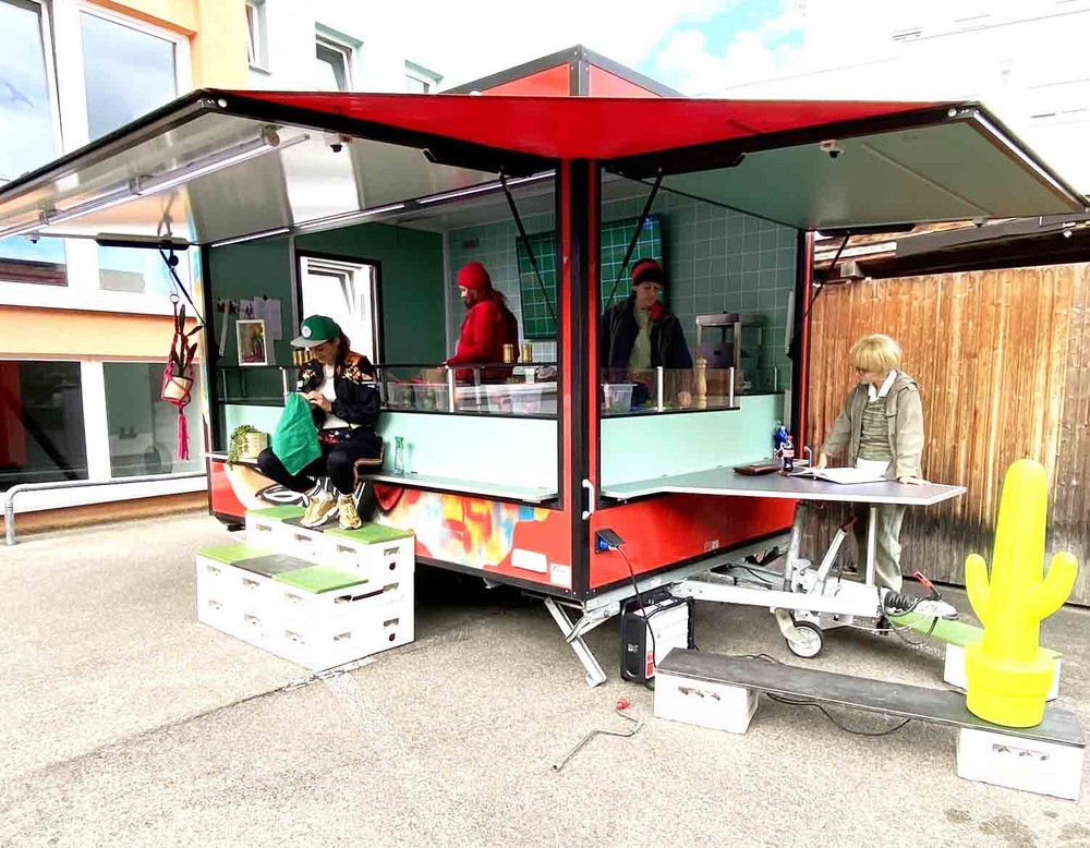 Auf dem Parkplatz hinter unserer Fachschule parkte ein bunter, mit Graffiti besprühter Imbisswagen. Eine besondere Bühne, auf welcher das Theaterkollektiv LOKSTOFF! für die Schulgemeinschaft mit zwei Vorstellungen gastierte. LOKSTOFF! ist dafür bekannt, an Orten des öffentlichen Lebens Theater zu spielen, um gesellschaftliche Themen zu positionieren und zur Reflexion anzuregen. Das Kollektiv spielt dort, wo die Menschen sind. So ist es nichts Ungewöhnliches eine Vorstellung im Möbelhaus (Stück: less home) oder in einem SelfStorage (Stück: Gestern. Morgen. Heute) zu besuchen.