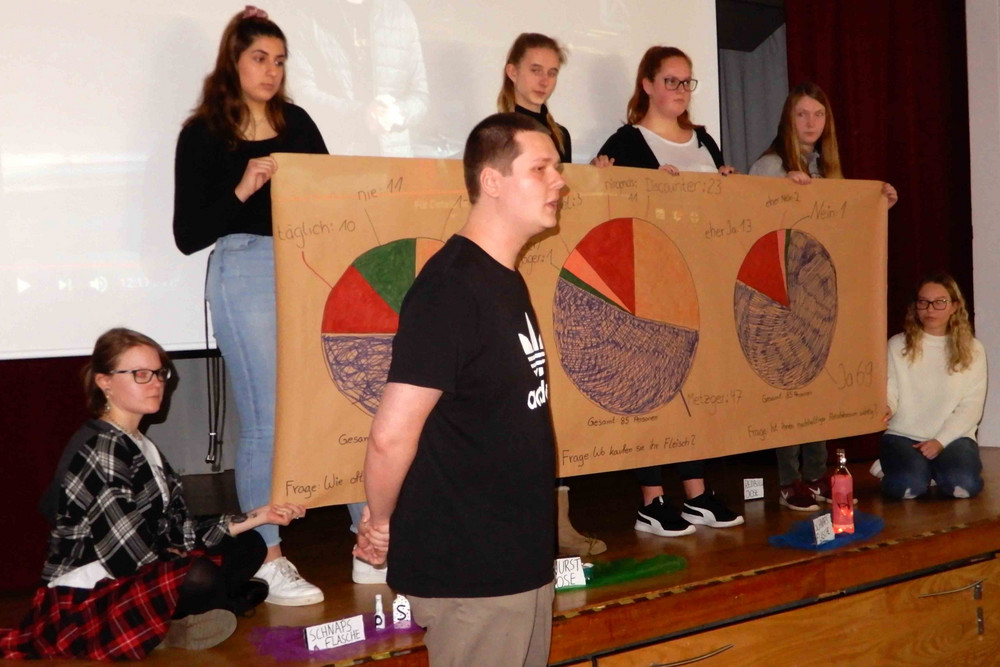 In einer Themenwoche haben wir uns dem Querschnittsthema Demokratie gewidmet. Die Schüler und Schülerinnen konnten sich klassenübergreifend einem von vier Themenbereichen zuordnen und darin eigene Fragstellungen verfolgen. Am Ende wurden die Erkenntnisse der Kleingruppen in einem großen Plenum vorgestellt. Präsentationsformen wie Anspiel, Quiz, Mitmachaktion, Plakat Ausstellung, Powerpoint, Filmsequenz und Impulsvortrag wurden gewält.