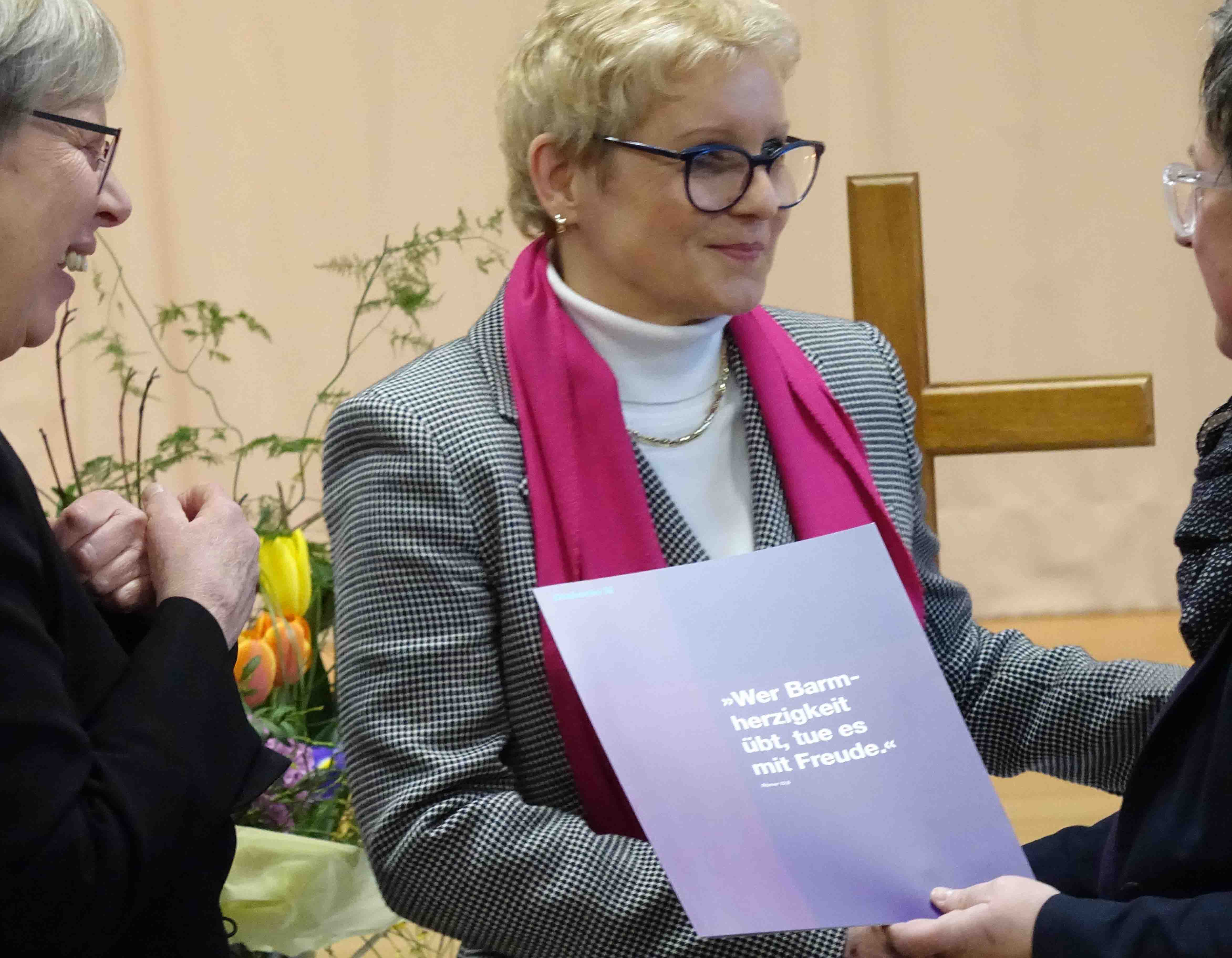 Zum 25-jährigen Dienstjubiläum erhielt Andrea Dohse das Kronenkreuz der Diakonie in Gold. „Zur Ehre Gottes haben Sie sich in den Dienst am Menschen nehmen lassen“, ist auf der Ehrenurkunde des Diakonischen Werks eingedruckt, die Diakonin Steffi Koch, Geschäftsführerin des Trägervereins, heute gemeinsam mit Direktorin Gabriele Beier überreicht hat. „Wir schätzen Ihr Engagement für das künstlerische und schöpferische Entdecken unserer Welt, das auch unserem Evangelischen Profil entspricht“, sagte Geschäftsführerin Koch in der Laudatio, „Ihre Arbeit ist ein wesentlicher Teil diakonischen Handelns und die Umsetzung des diakonischen Auftrags.“