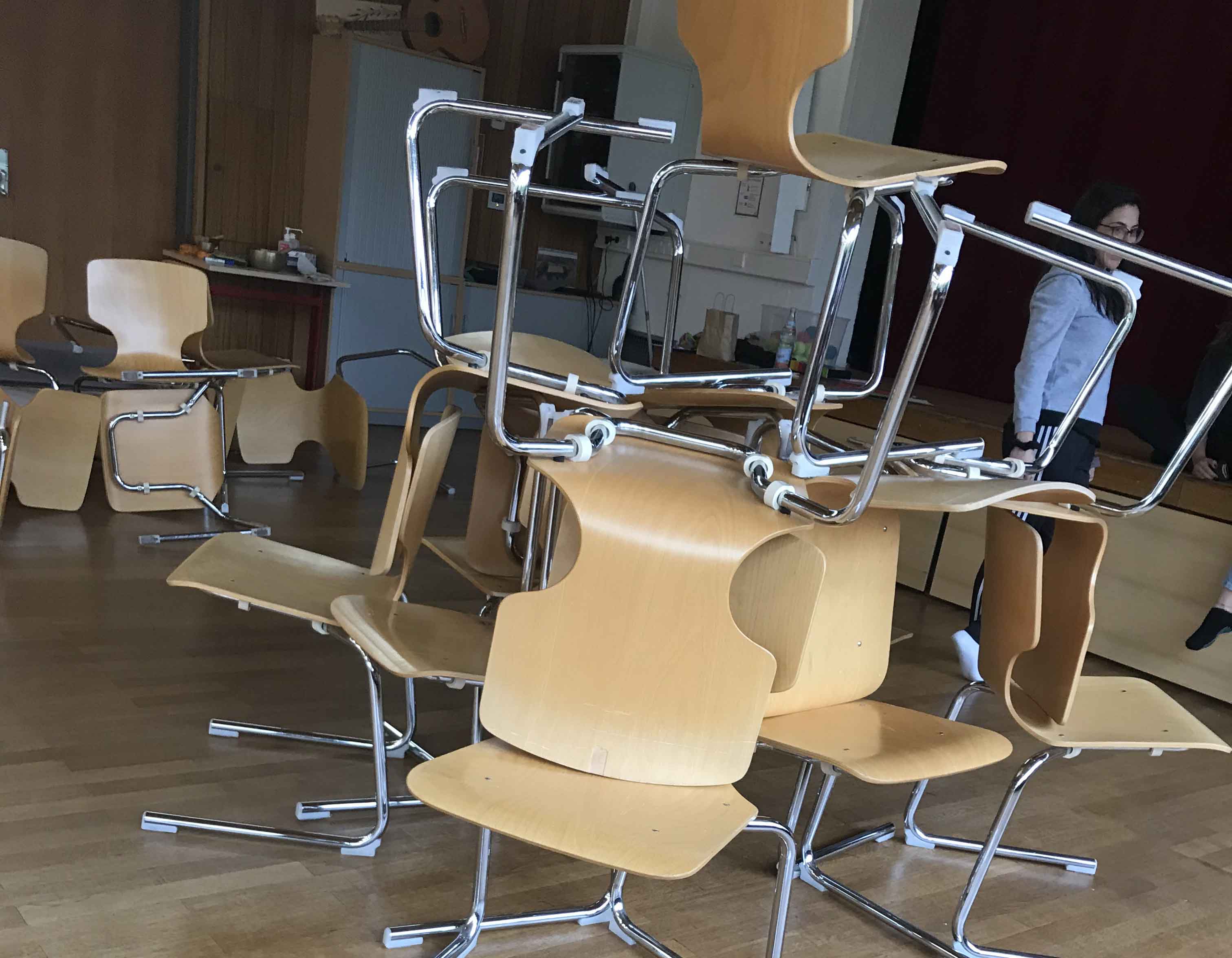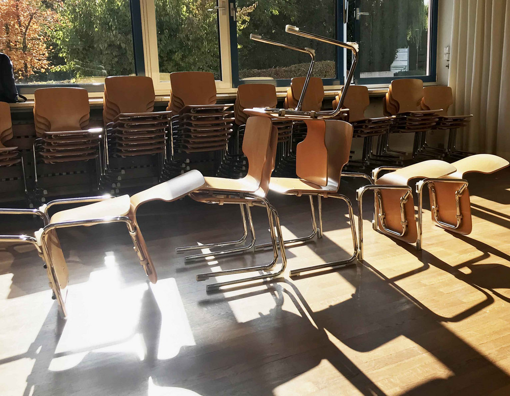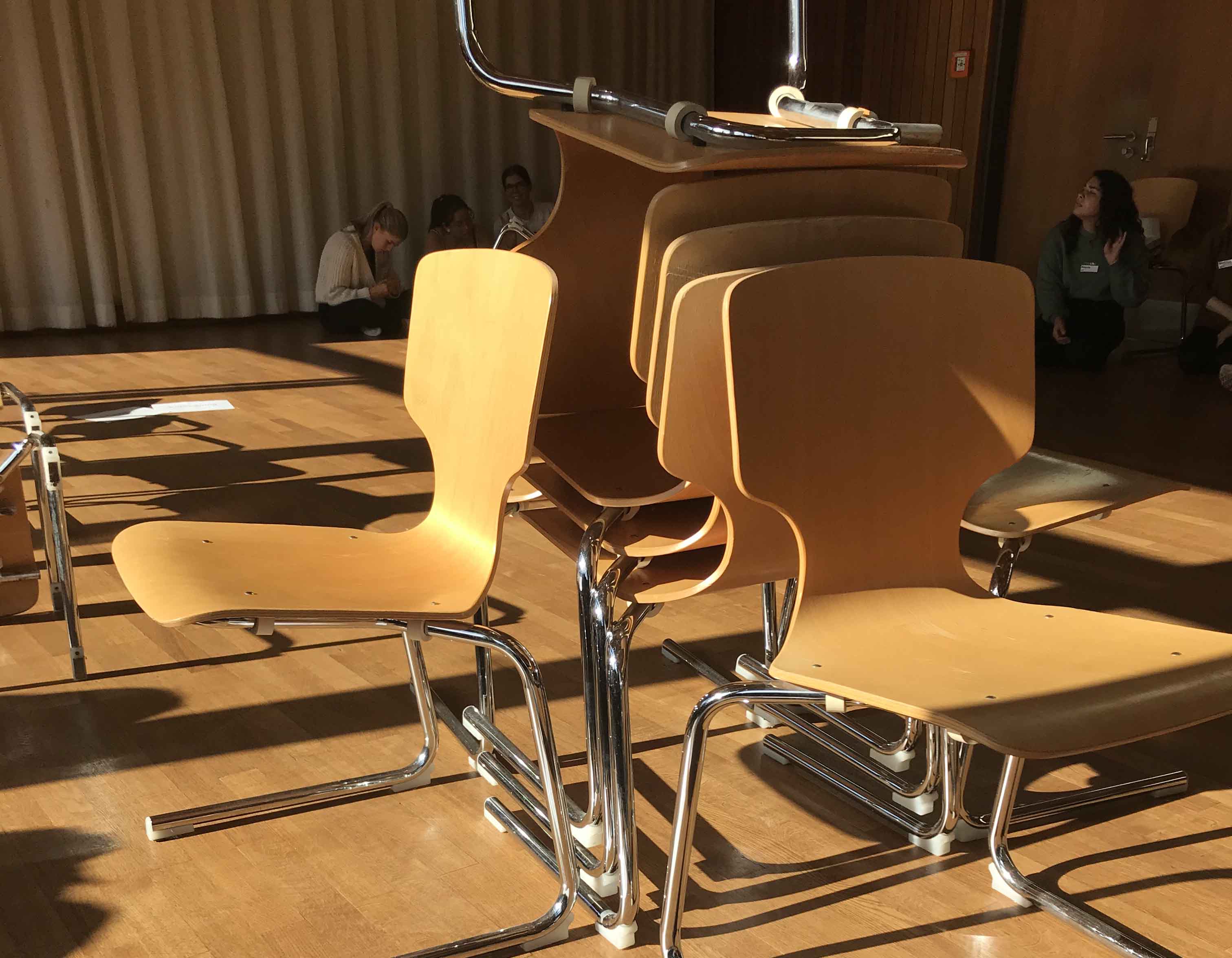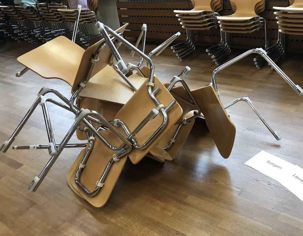 Im Rahmen des Unterrichts haben wir uns mit dem Requisit "Stuhl" und dessen Ausdruck beschäftigt. Die Schülerinnen und Schüler bauten gemäß dem Spiel-Prinzip „Zug um Zug“ aus dem Requisit eine Skulptur. Die Herausforderung dabei war: Der Bau erfolgte nonverbal und in abwartender Haltung, das heißt es wurde nacheinander - Zug um Zug - aufgebaut, ohne miteinander zu sprechen.