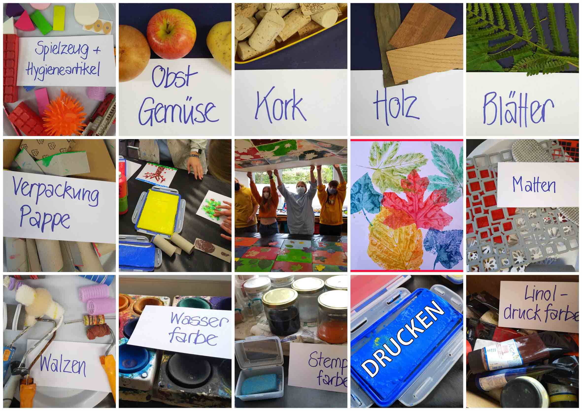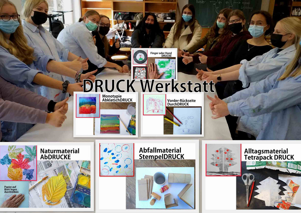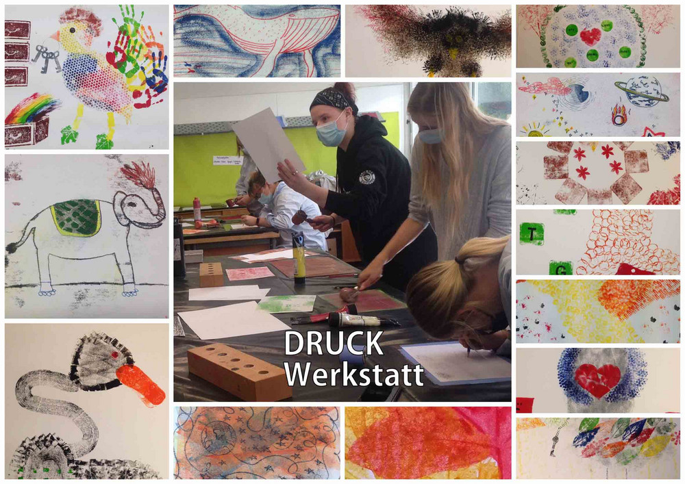 Im ersten Unterrichtsblock hat sich der Werkraum in eine Druckwerkstatt verwandelt. In halben Klassen haben die „Neuen“ aus dem Berufskolleg und die „Alten“ aus dem Oberkurs die Möglichkeit, im Werkraum verschiedene Drucktechniken mit unterschiedlichen Materialien und Farben kennenzulernen.