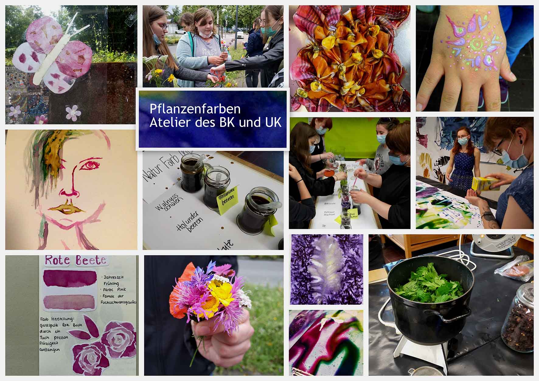 Die Schülerinnen und Schüler aus Berufskolleg und Unterkurs haben über mehrere Wochen im Pflanzenfarben-Atelier gearbeitet - im Kreativraum der Schule. Unter Anleitung der Kunstdozentinnen konnten sie entdecken, wie man die Farben, die in Pflanzen stecken, gewinnen und in verschiedene Techniken und Gestaltungsformen überführen kann: Batik, Eco-Print, Körperbemalung, Fensterbilder ...